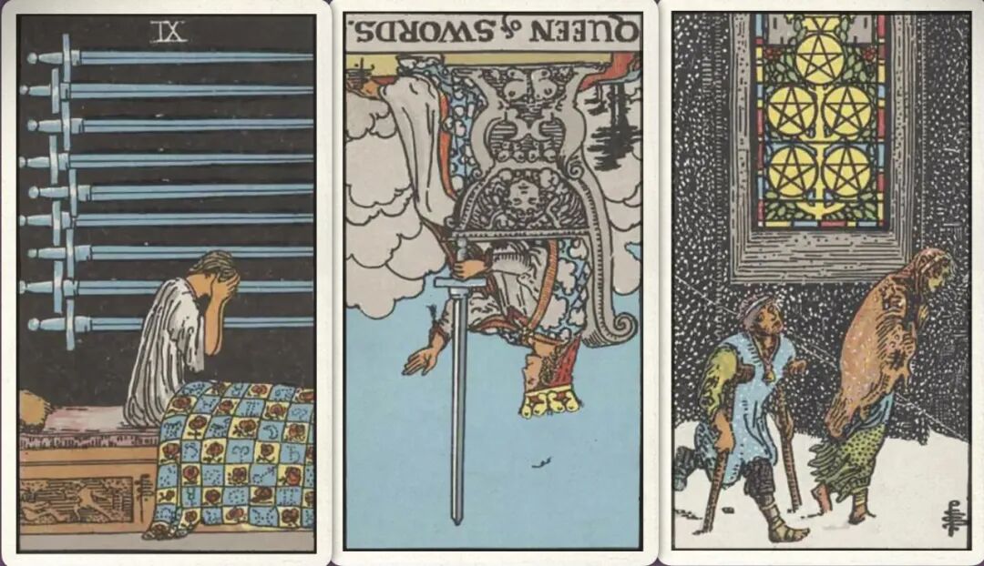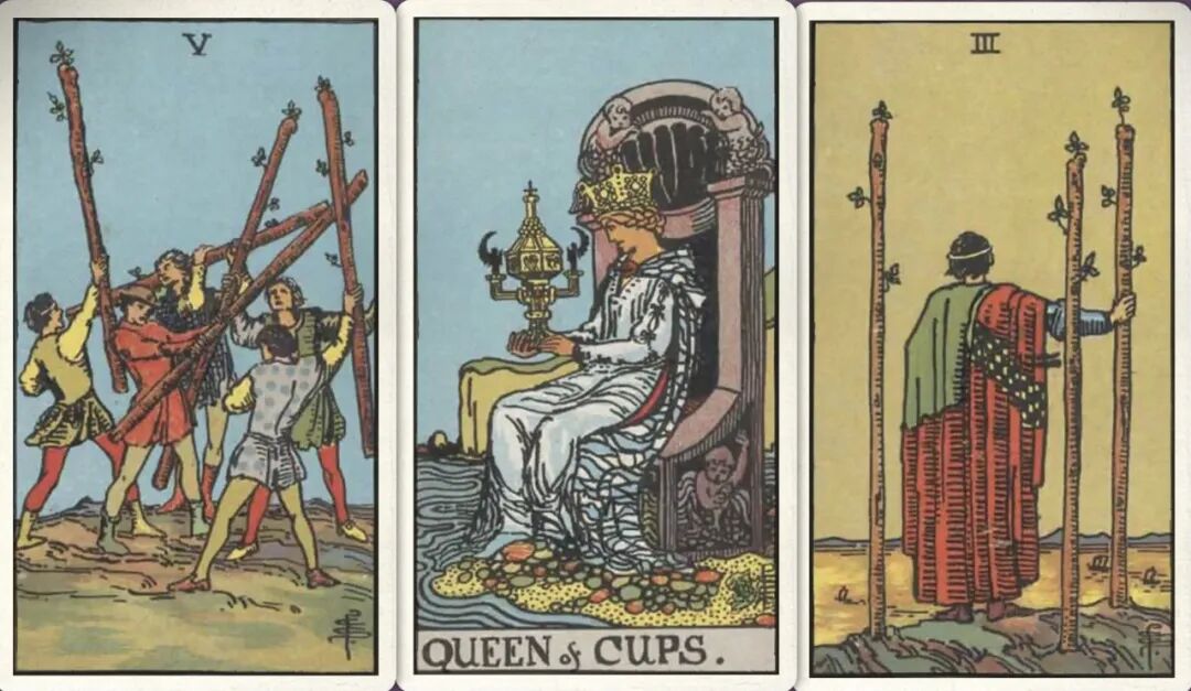 牌:权杖五+ 圣杯皇后+ 权杖三+