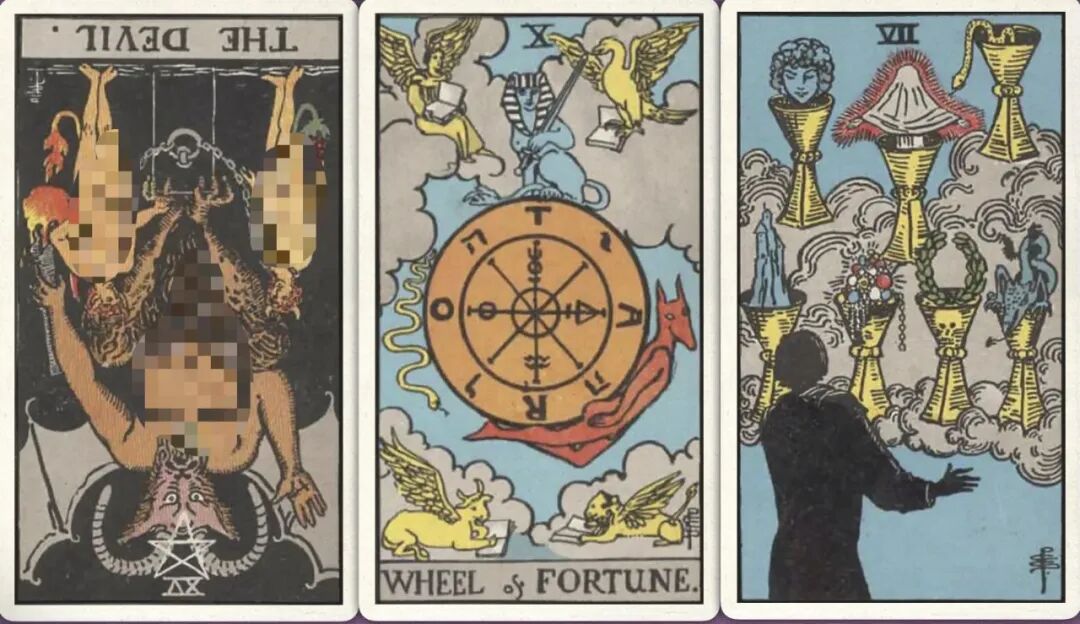 牌:恶魔- 命运之轮+ 圣杯七+