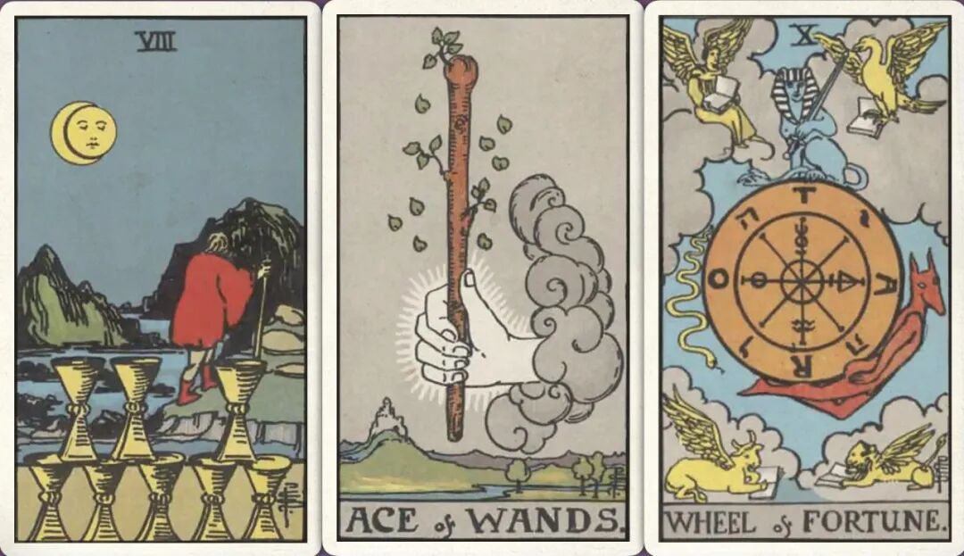 牌:圣杯八+ 权杖ace+ 命运之轮+