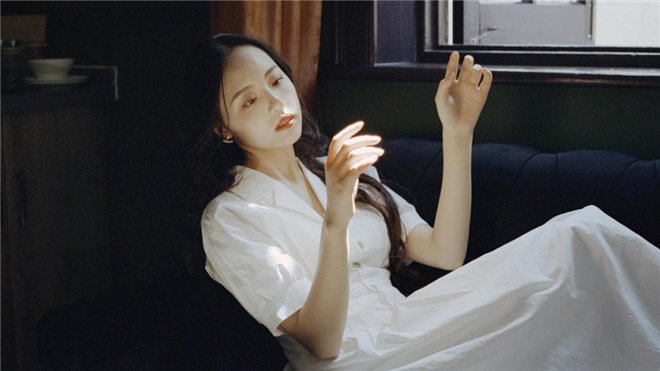 连衣裙:水蓝色垂感茶歇裙(水气温润,气场沉稳)