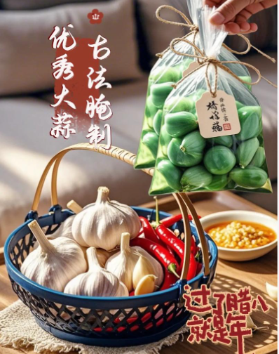 vs 普通糖蒜(甜蒜):普通糖蒜以大量白糖腌制,口感虽甜脆,但含糖量极高。腊八蒜以醋为本,通常只用少量糖或不用糖来平衡风味,其低糖、低热量的特点,更适合现代健康饮食需求,尤其对需要控制血糖和体重的人群更为友好。