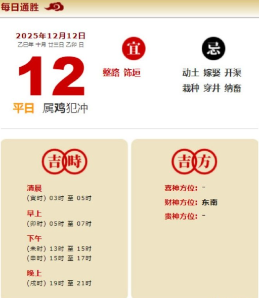 易学董老师:2025年12月12日 每日通胜+今日生肖红黑榜