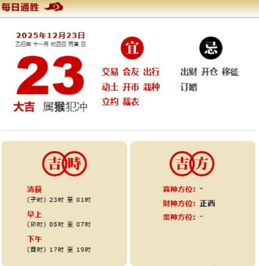 易学董老师:2025年12月23日 每日通胜+今日生肖红黑榜