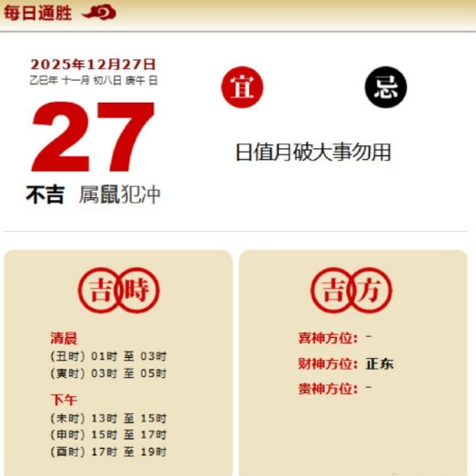 易学董老师:2025年12月27日 每日通胜+今日生肖红黑榜