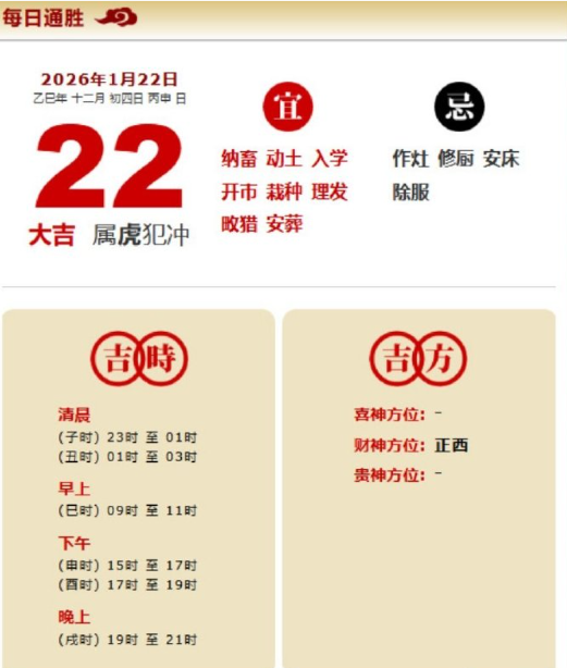 易学董老师:2026年1月22日 每日通胜+今日生肖红黑榜