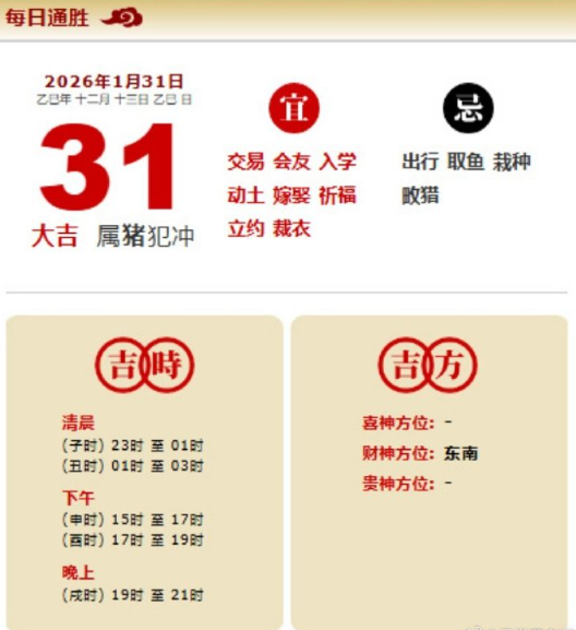 易学董老师:2026年1月31日 每日通胜+今日生肖红黑榜