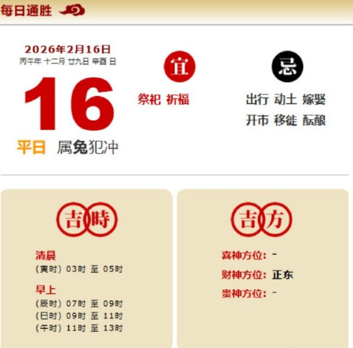 易学董老师:2026年2月16日 每日通胜+今日生肖红黑榜