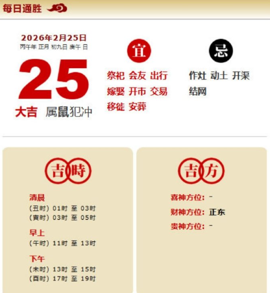 易学董老师:2026年2月25日 每日通胜+今日生肖红黑榜