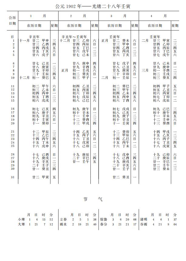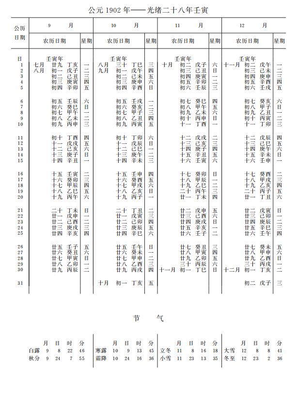 紫金山天文台万年历1902年电子版,新编万年历之1902年(壬寅虎年)