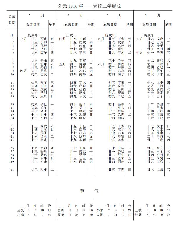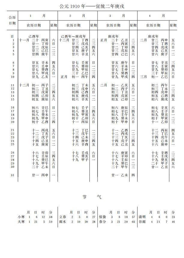 紫金山天文台万年历1910年电子版,新编万年历之1910年(庚戌狗年)