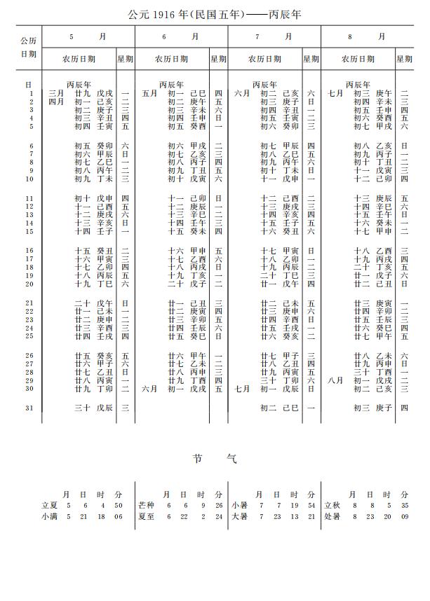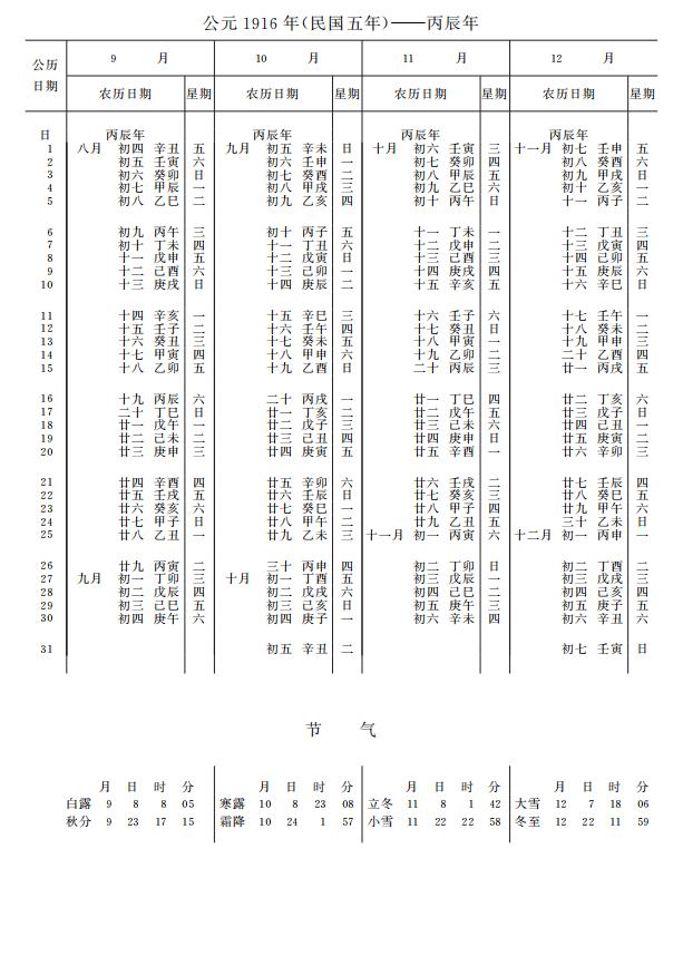 紫金山天文台万年历1916年电子版,新编万年历之1916年(丙辰龙年)