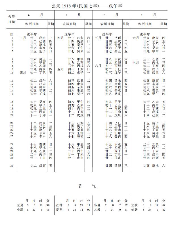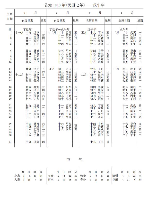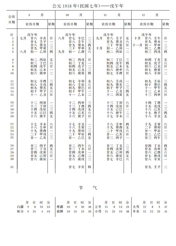 紫金山天文台万年历1918年电子版,新编万年历之1918年(戊午马年)