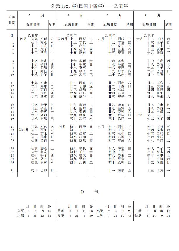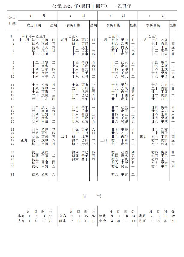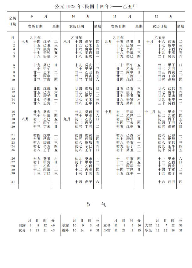 紫金山天文台万年历1925年电子版,新编万年历之1925年(乙丑牛年)