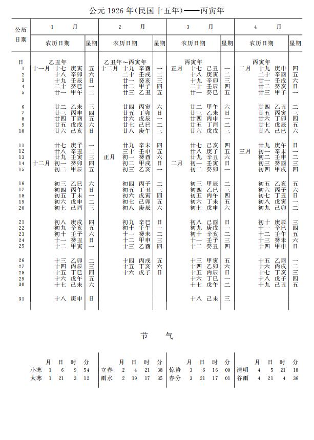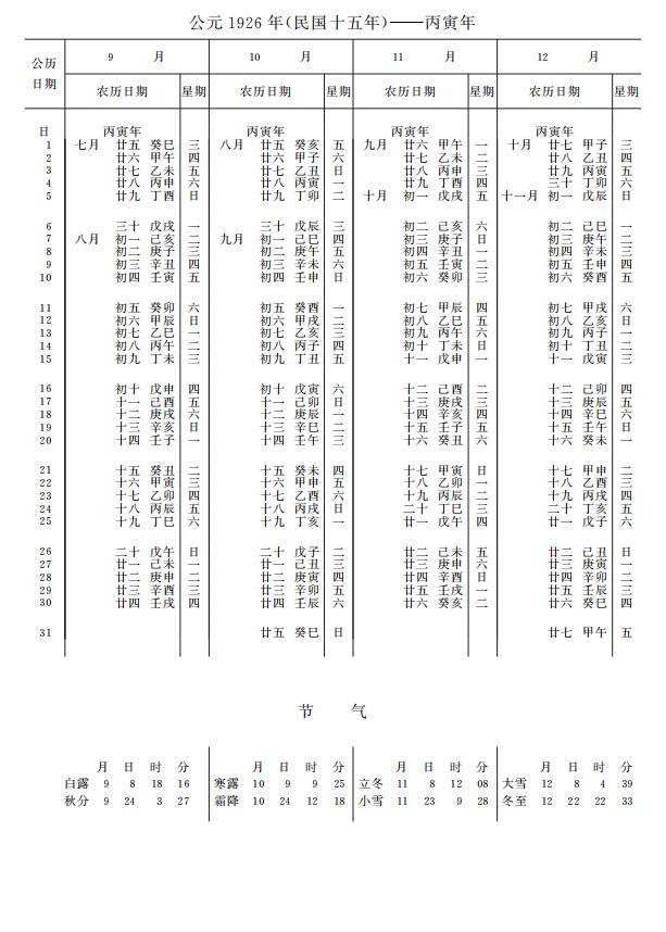 紫金山天文台万年历1926年电子版,新编万年历之1926年(丙寅虎年)