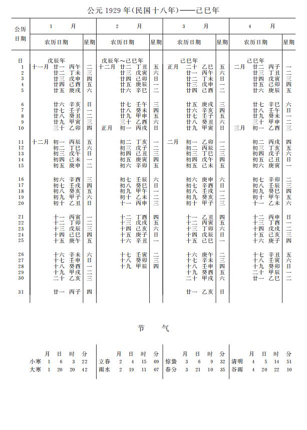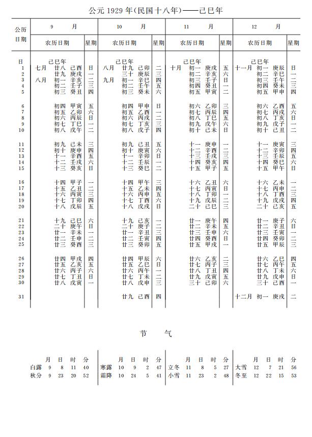 紫金山天文台万年历1929年电子版,新编万年历之1929年(己巳蛇年)