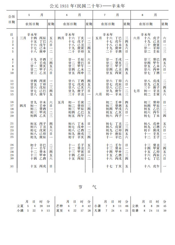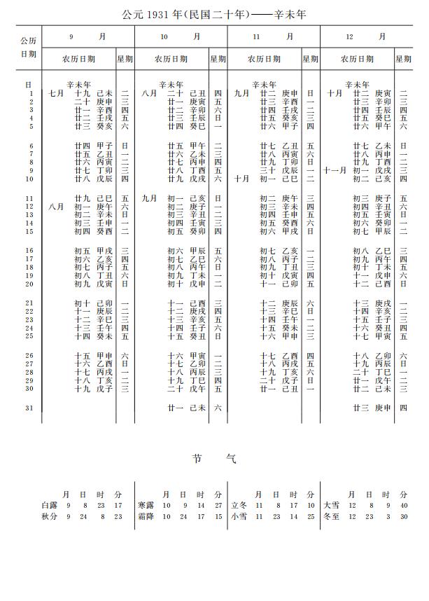 紫金山天文台万年历1931年电子版,新编万年历之1931年(辛未羊年)