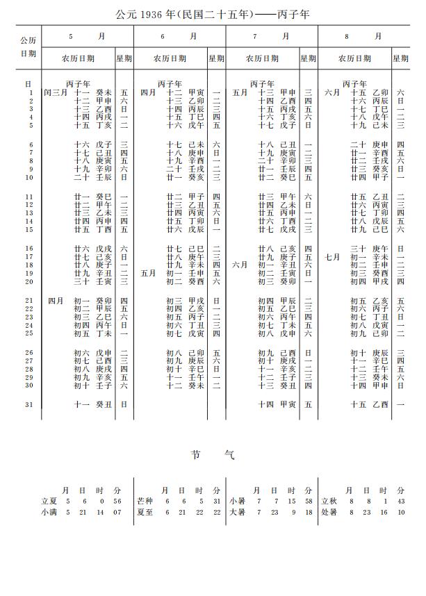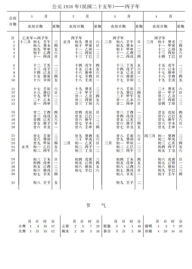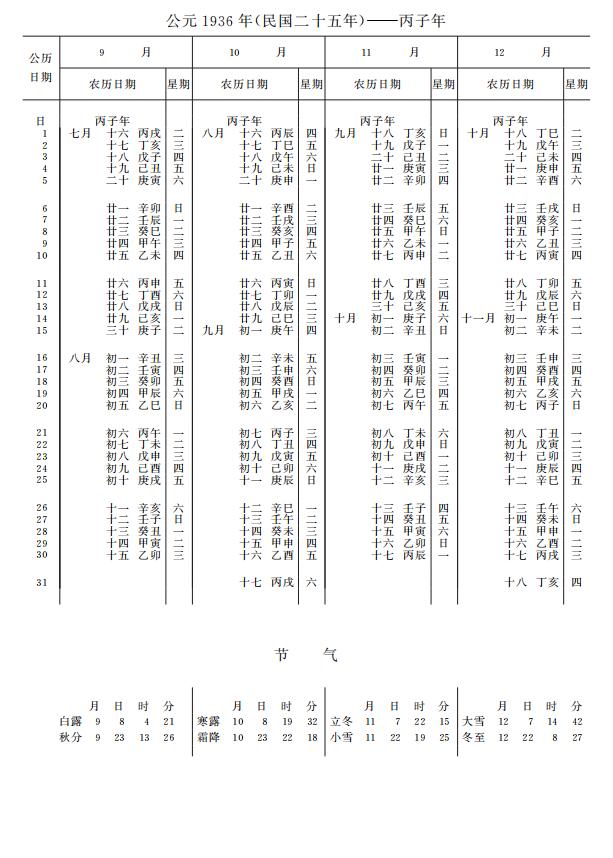 紫金山天文台万年历1936年电子版,新编万年历之1936年(丙子鼠年)