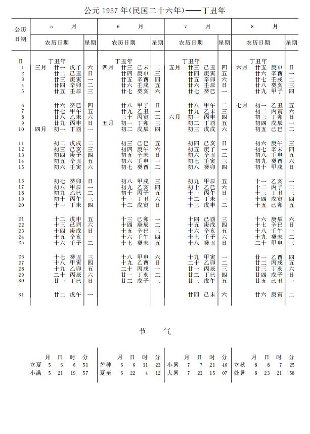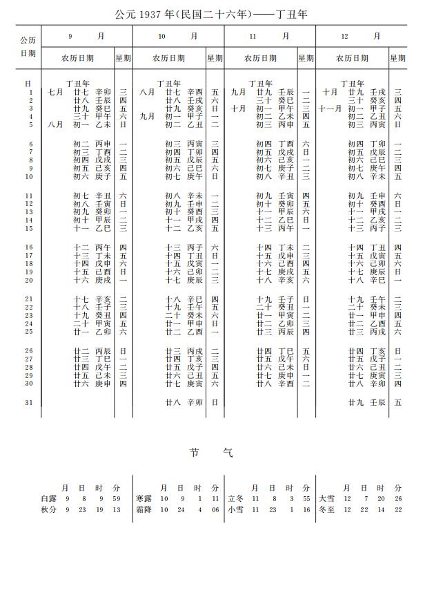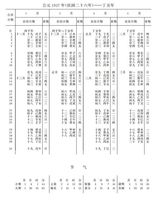 紫金山天文台万年历1937年电子版,新编万年历之1937年(丁丑牛年)