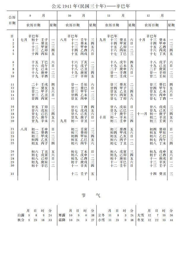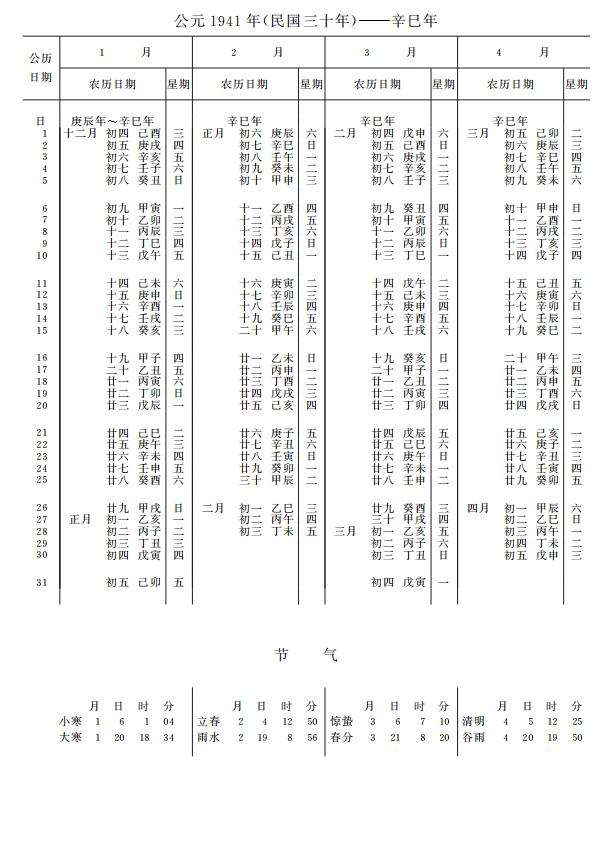 紫金山天文台万年历1941年电子版,新编万年历之1941年(辛巳蛇年)