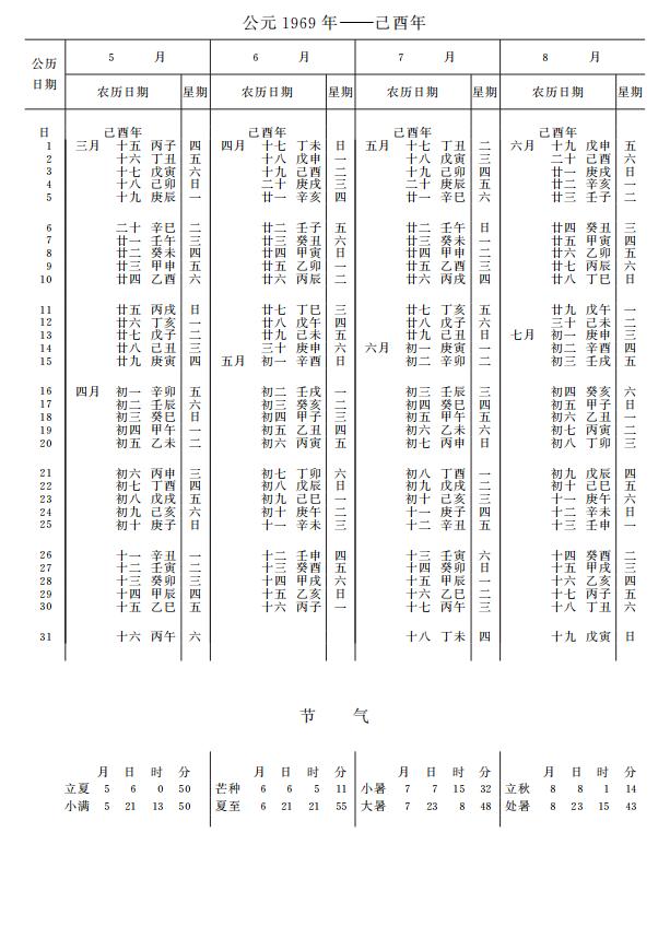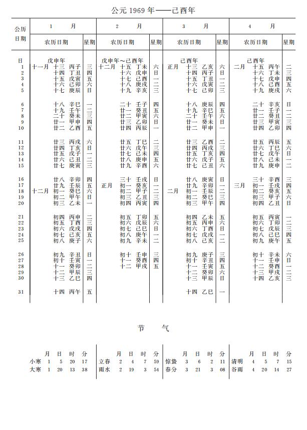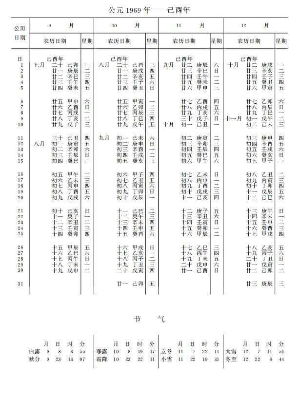 紫金山天文台万年历1969年电子版,新编万年历之1969年(己酉鸡年)
