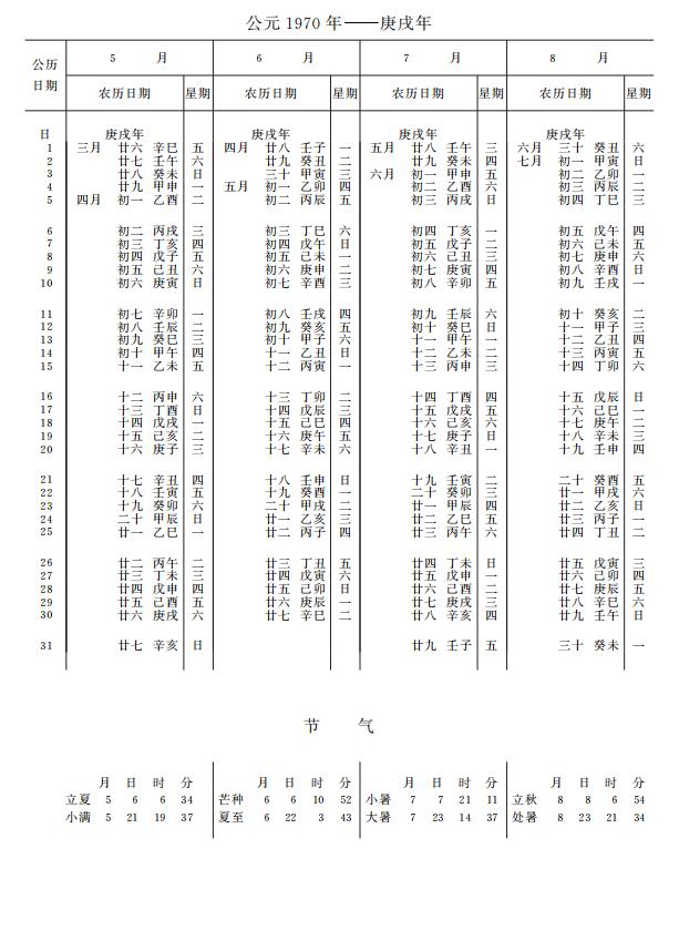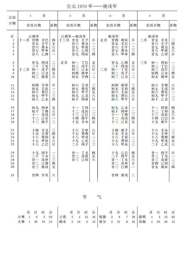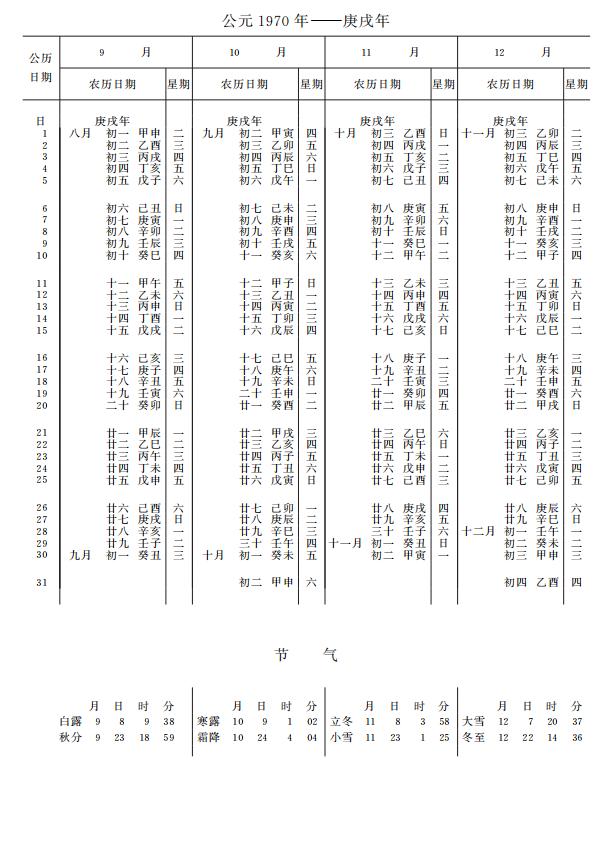 紫金山天文台万年历1970年电子版,新编万年历之1970年(庚戌狗年)