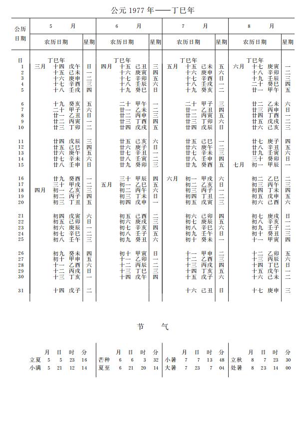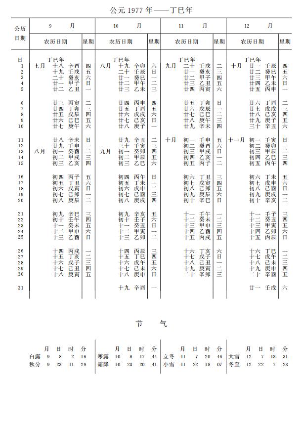 紫金山天文台万年历1977年电子版,新编万年历之1977年(丁巳蛇年)