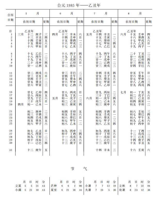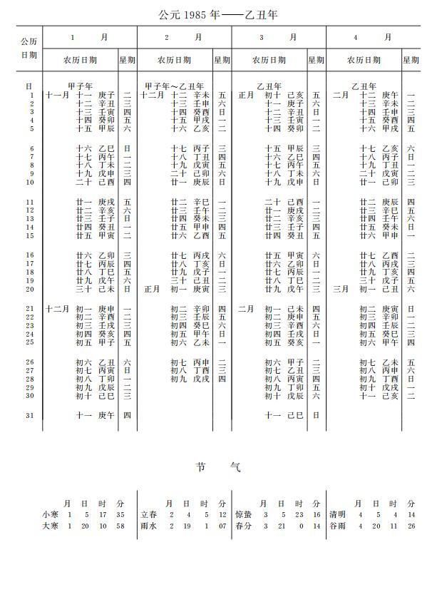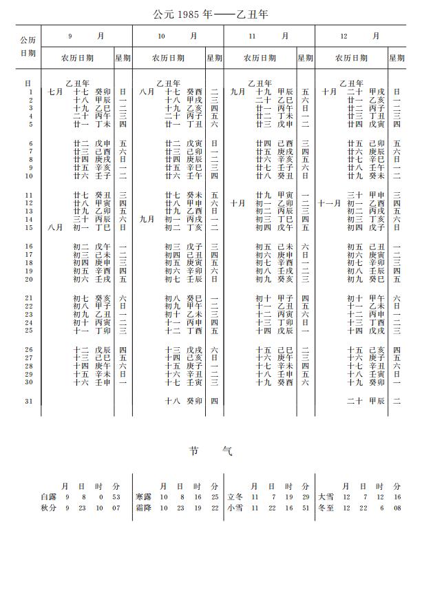 紫金山天文台万年历1985年电子版,新编万年历之1985年(乙丑牛年)