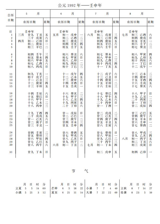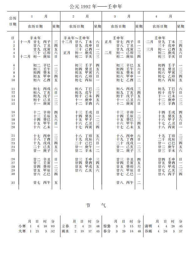 紫金山天文台万年历1992年电子版,新编万年历之1992年(壬申猴年)