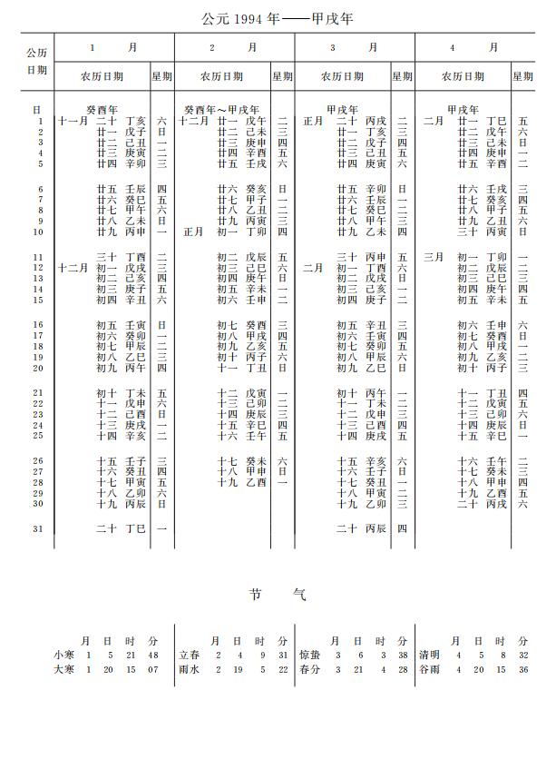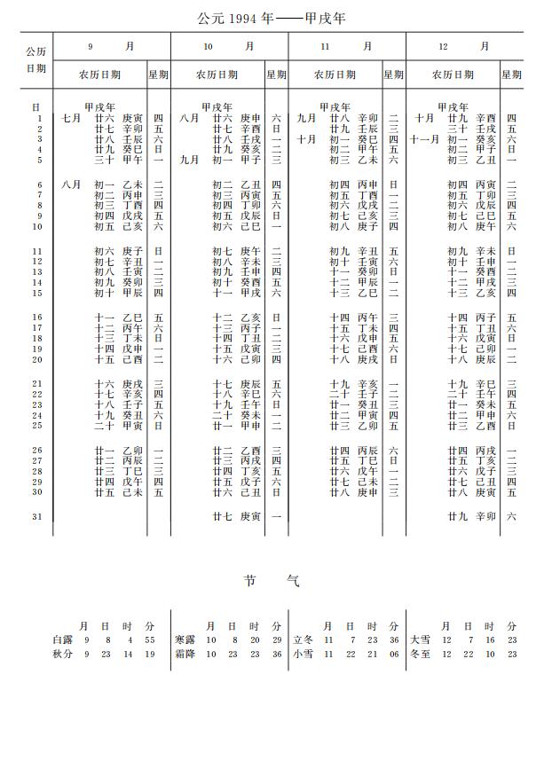 紫金山天文台万年历1994年电子版,新编万年历之1994年(甲戌狗年)