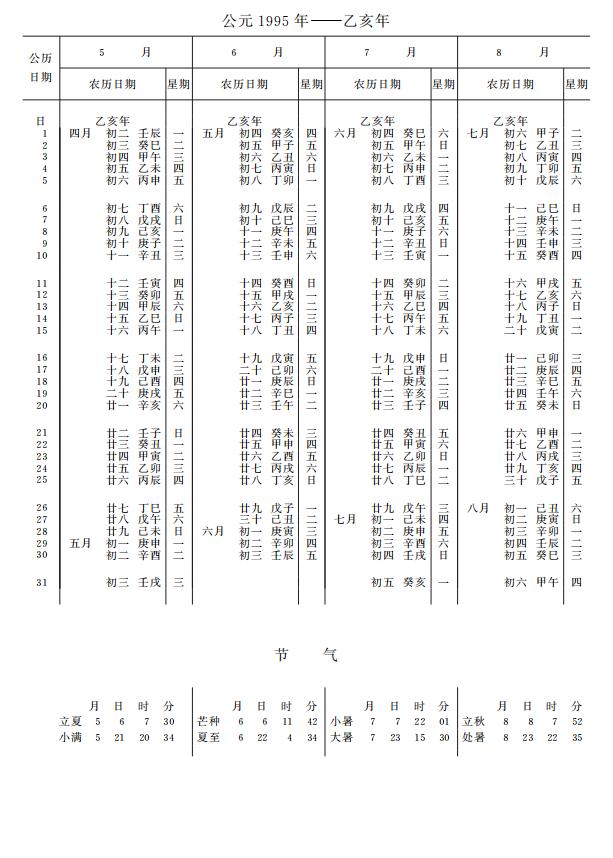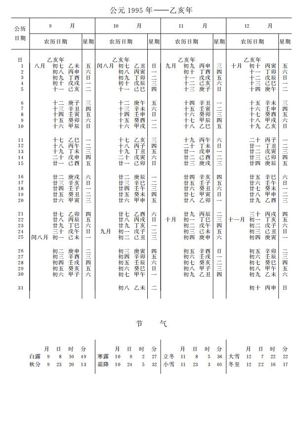 紫金山天文台万年历1995年电子版,新编万年历之1995年(乙亥猪年)