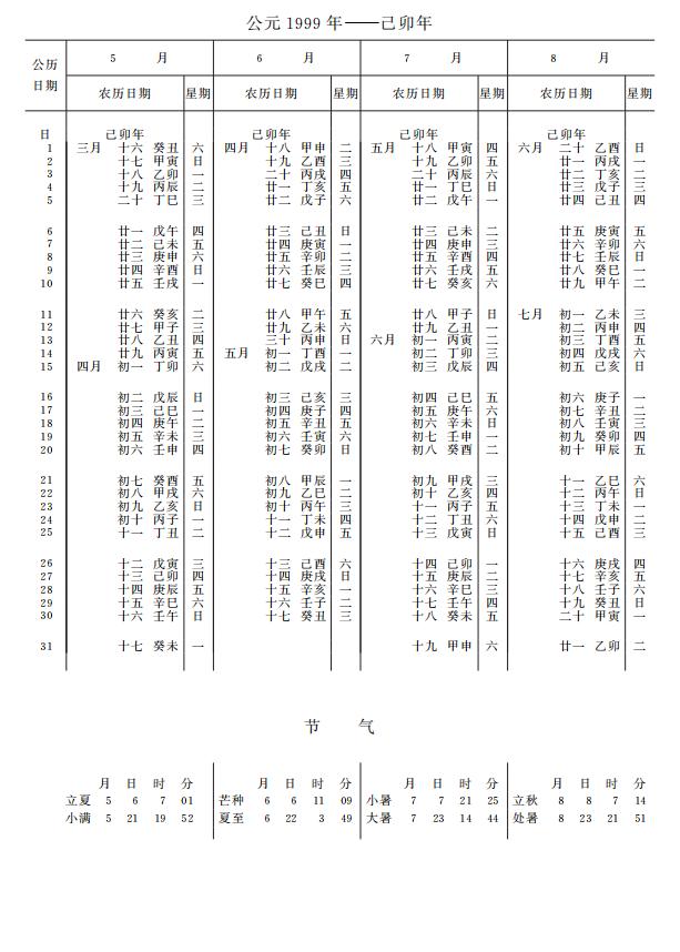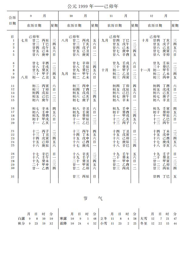 紫金山天文台万年历1999年电子版,新编万年历之1999年(己卯兔年)