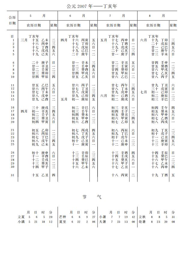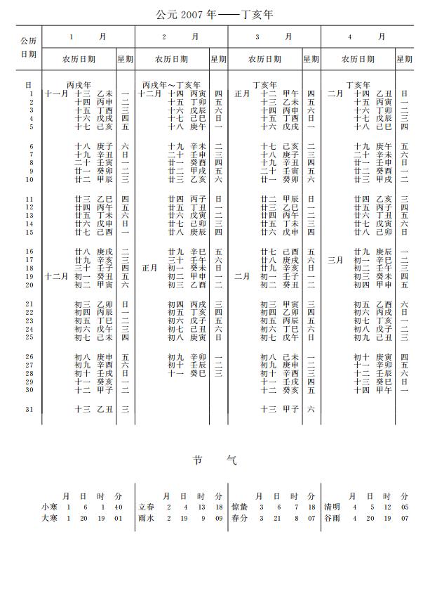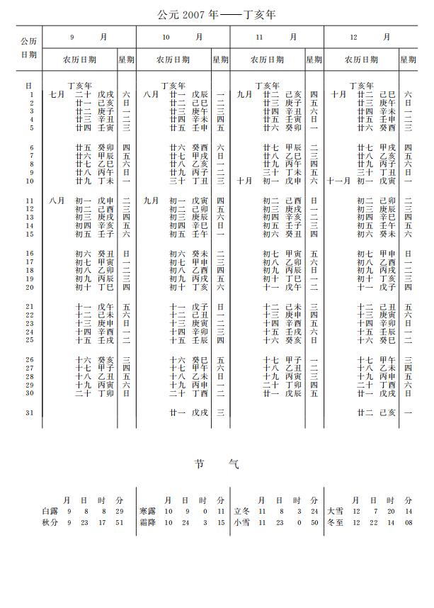 紫金山天文台万年历2007年电子版,新编万年历之2007年(丁亥猪年)