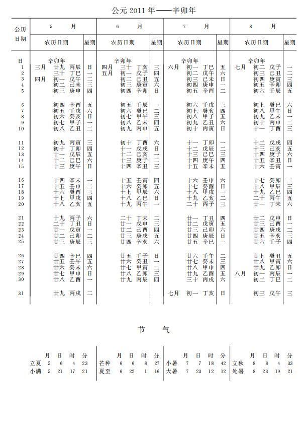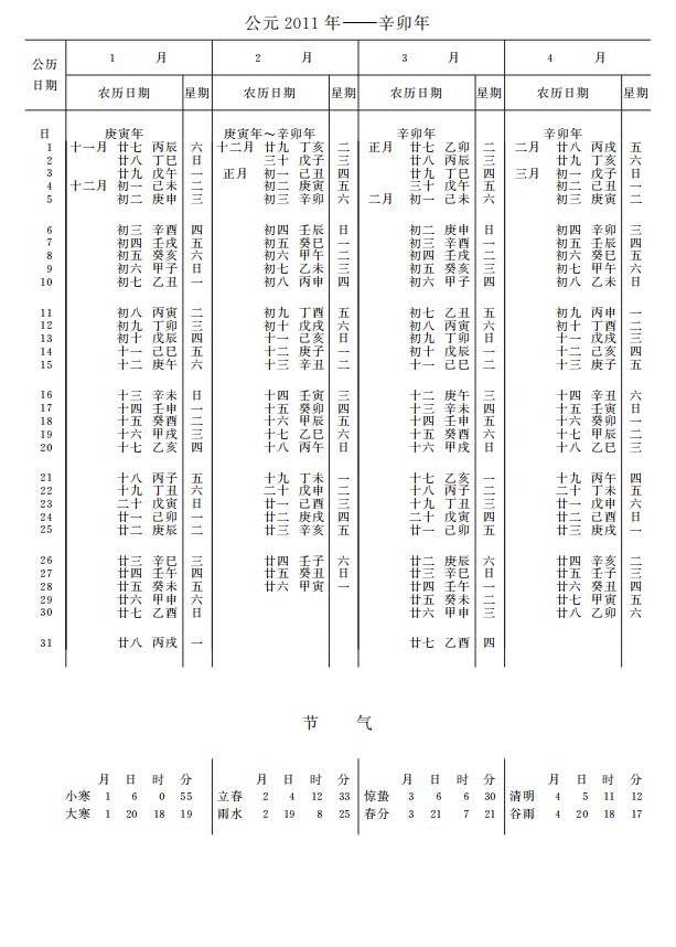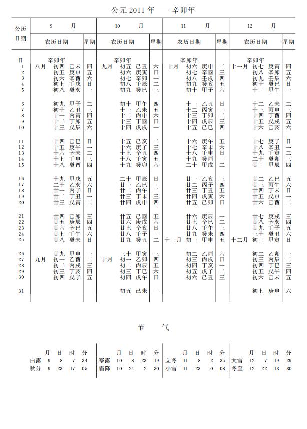 紫金山天文台万年历2011年电子版,新编万年历之2011年(辛卯兔年)