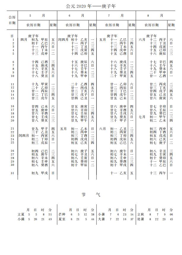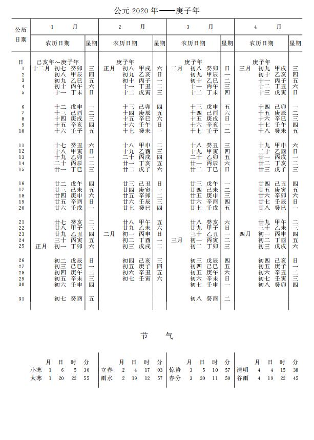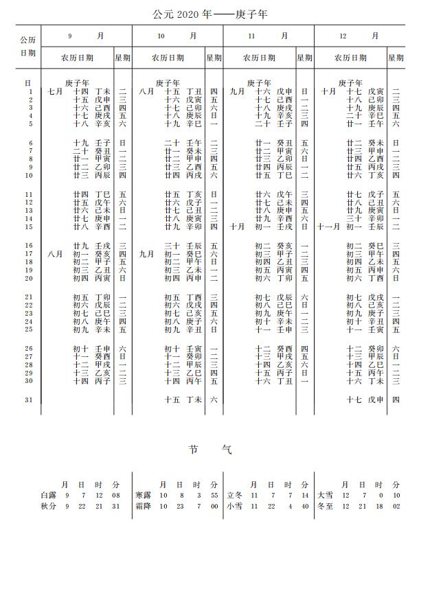 紫金山天文台万年历2020年电子版,新编万年历之2020年(庚子鼠年)