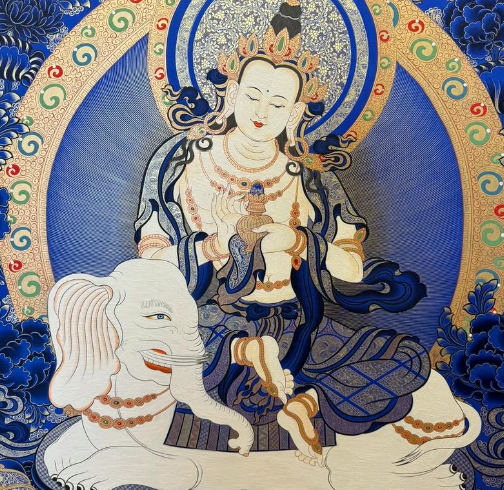 普贤菩萨,是象征理德、行德的菩萨,与文殊的智德、证德相对。他发下十大行愿,以无尽的慈悲行愿,实践佛陀的教法。其坐骑为六牙白象,象征愿行殷深,辛勤不倦。其功德主司德行、实践力、延寿与护佑。他能帮助众生将理想付诸行动,圆满各种愿望。