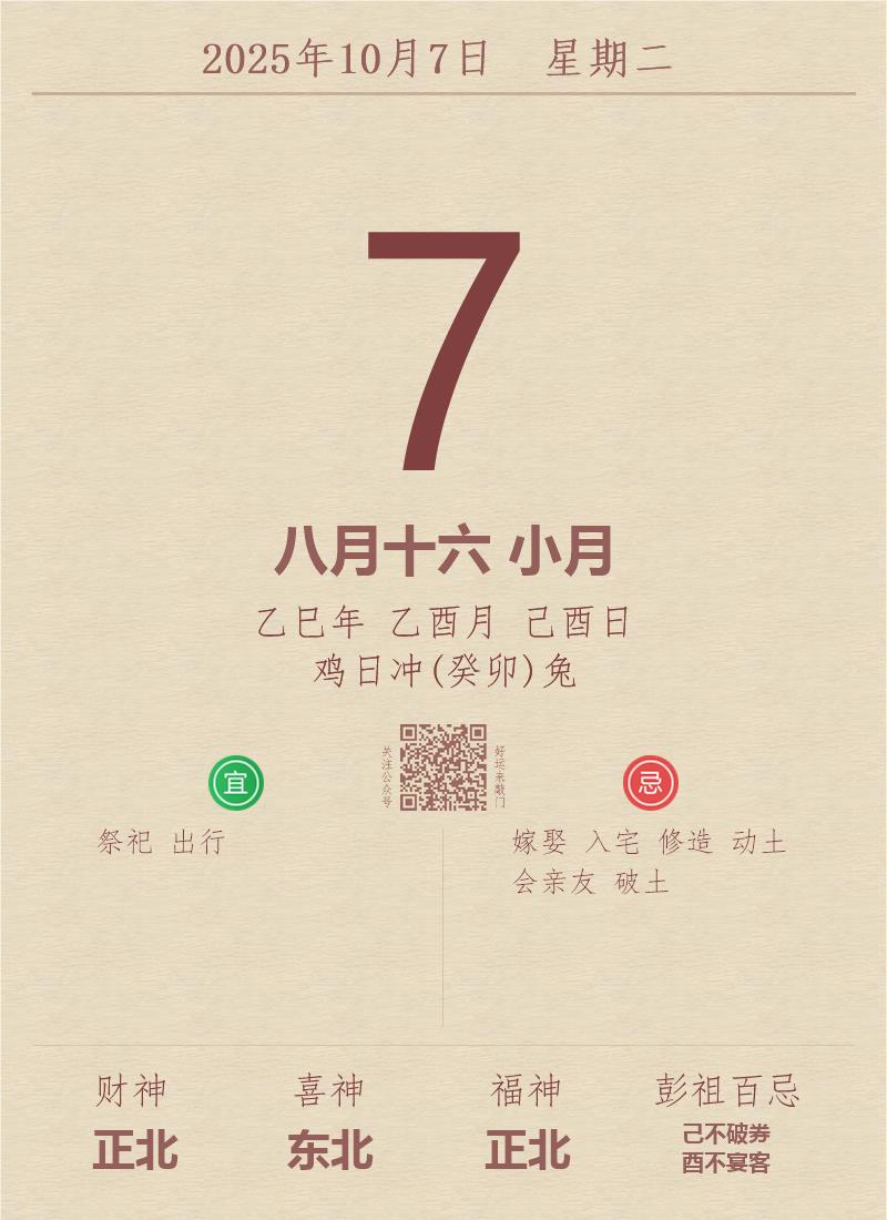今日老黄历(2025年10月7日):黄历宜忌、财神方位、特吉生肖、打麻将财位