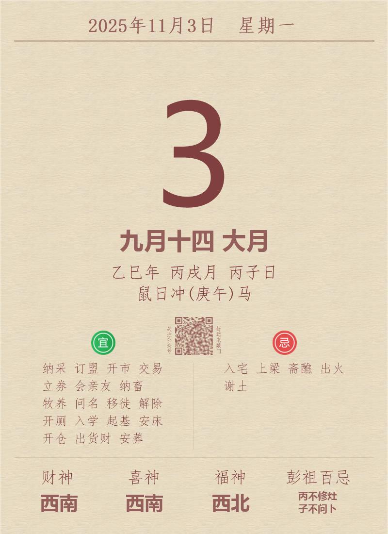 今日老黄历(2025年11月3日):黄历宜忌、财神方位、特吉生肖、打麻将财位