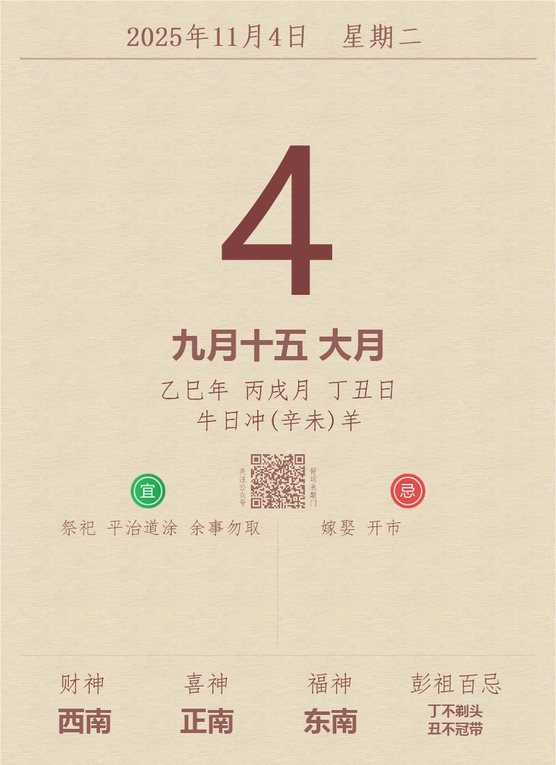 今日老黄历(2025年11月4日):黄历宜忌、财神方位、特吉生肖、打麻将财位
