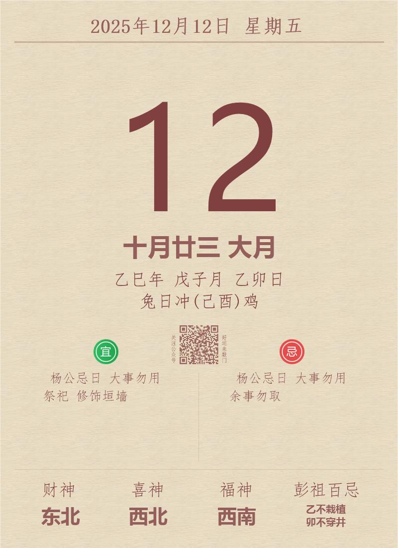 今日老黄历(2025年12月12日):黄历宜忌、财神方位、特吉生肖、打麻将财位