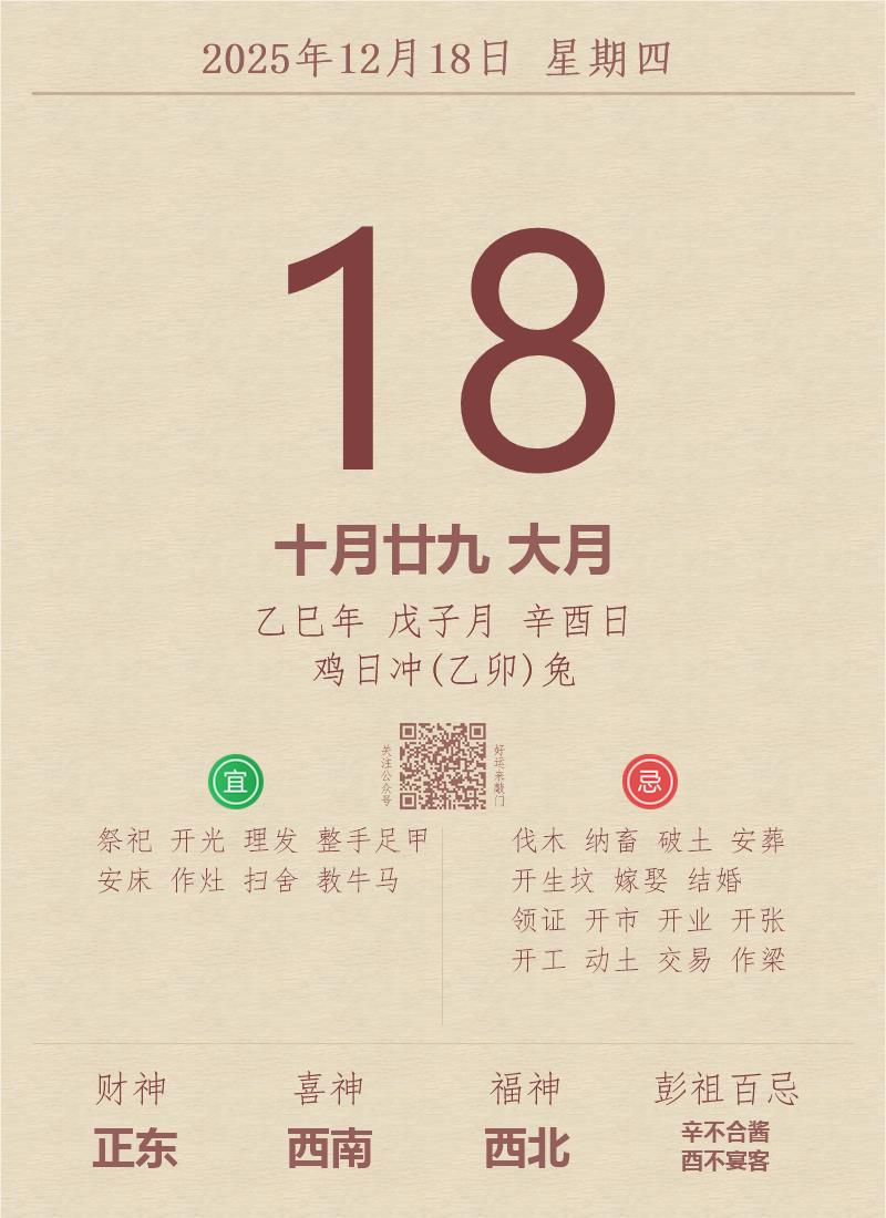 今日老黄历(2025年12月18日):黄历宜忌、财神方位、特吉生肖、打麻将财位