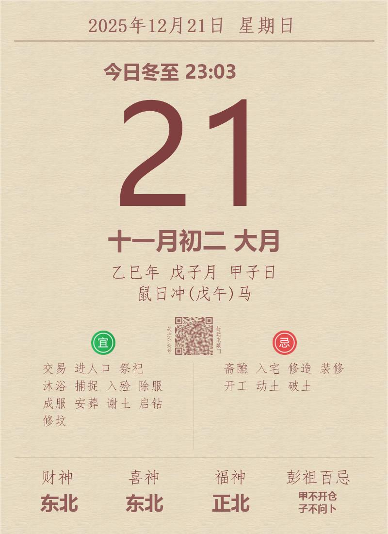 今日老黄历(2025年12月21日):黄历宜忌、财神方位、特吉生肖、打麻将财位