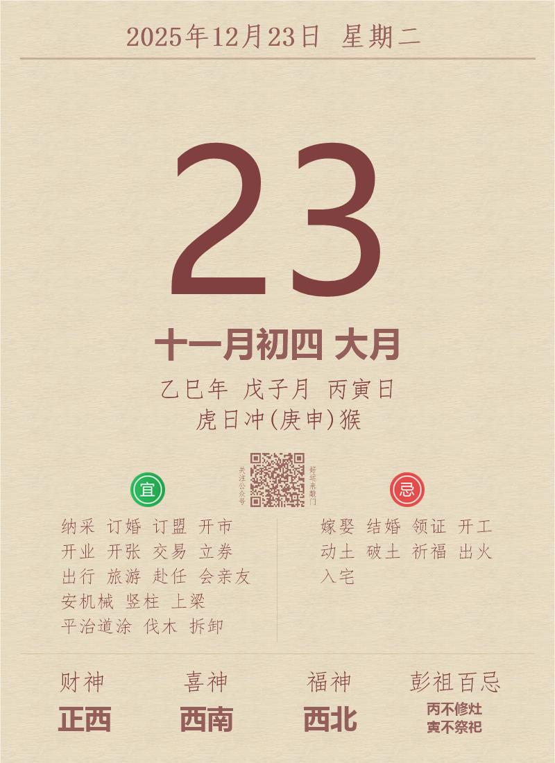 今日老黄历(2025年12月23日):黄历宜忌、财神方位、特吉生肖、打麻将财位