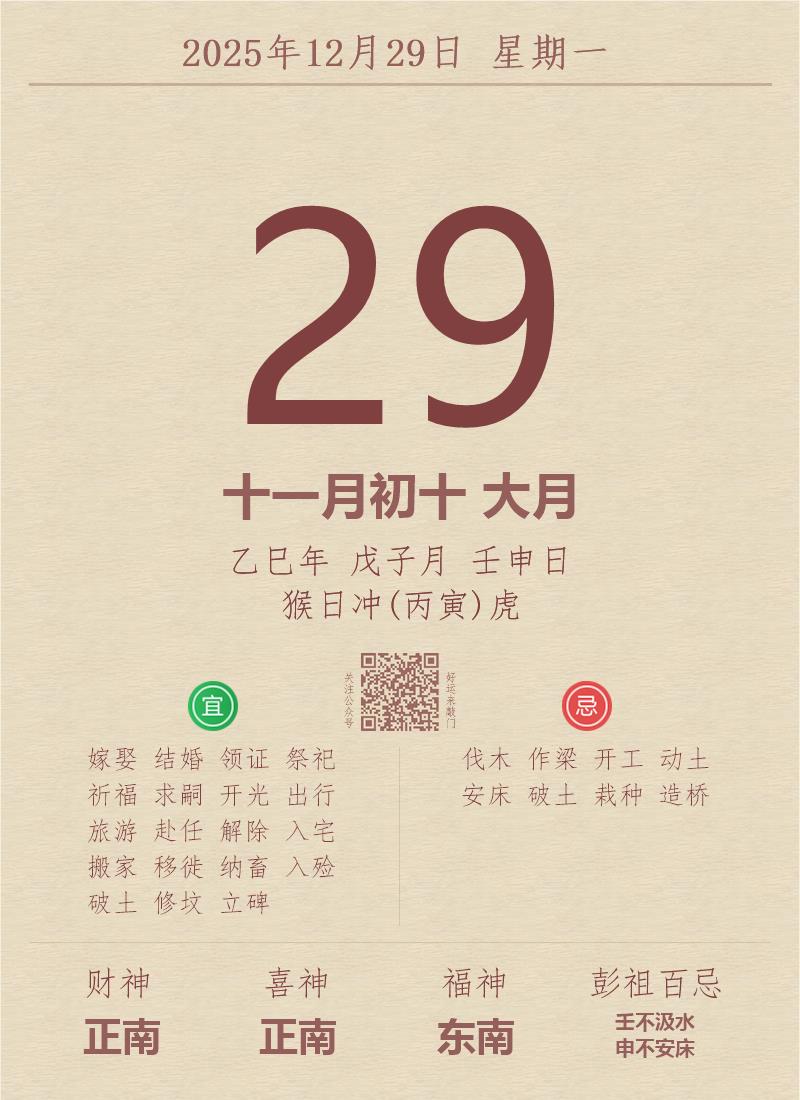 今日老黄历(2025年12月29日):黄历宜忌、财神方位、特吉生肖、打麻将财位
