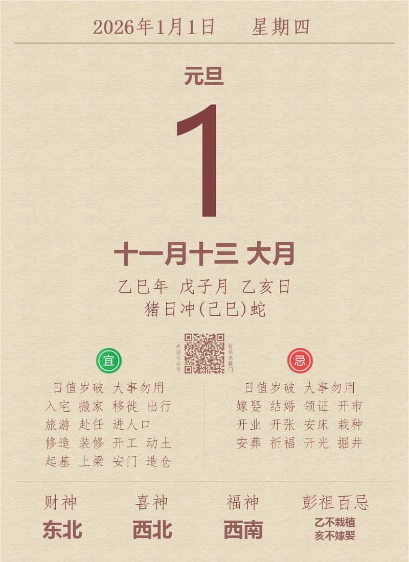 今日老黄历(2026年1月1日):黄历宜忌、财神方位、特吉生肖、打麻将财位