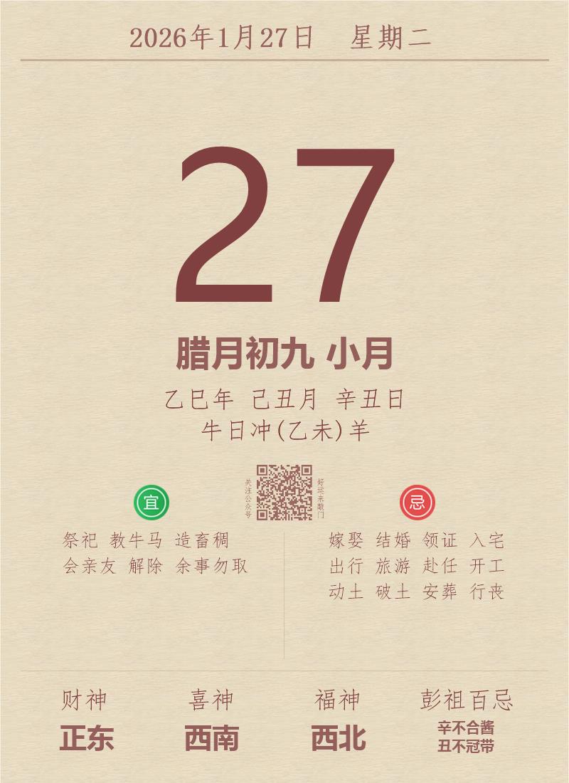 今日老黄历(2026年1月27日):黄历宜忌、财神方位、特吉生肖、打麻将财位