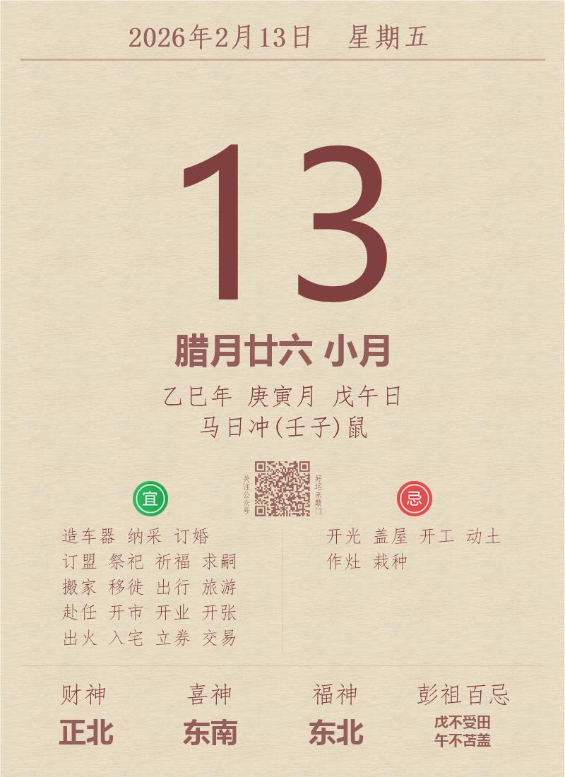 今日老黄历(2026年2月13日):黄历宜忌、财神方位、特吉生肖、打麻将财位
