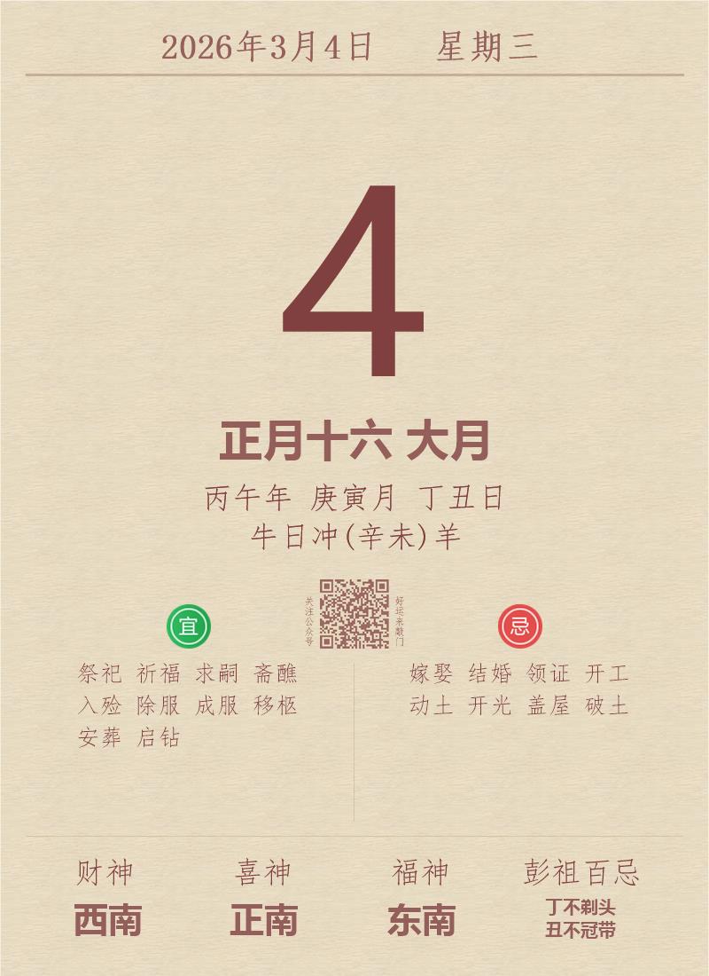 今日老黄历(2026年3月4日):黄历宜忌、财神方位、特吉生肖、打麻将财位