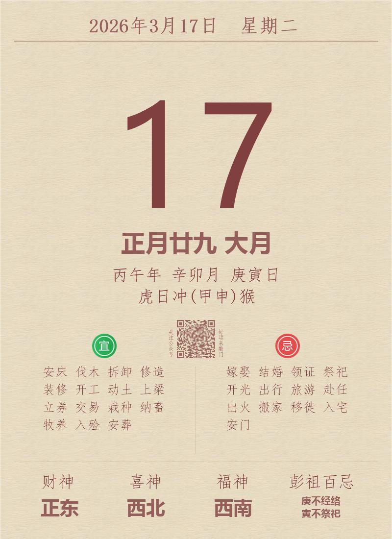 今日老黄历(2026年3月17日):黄历宜忌、财神方位、特吉生肖、打麻将财位