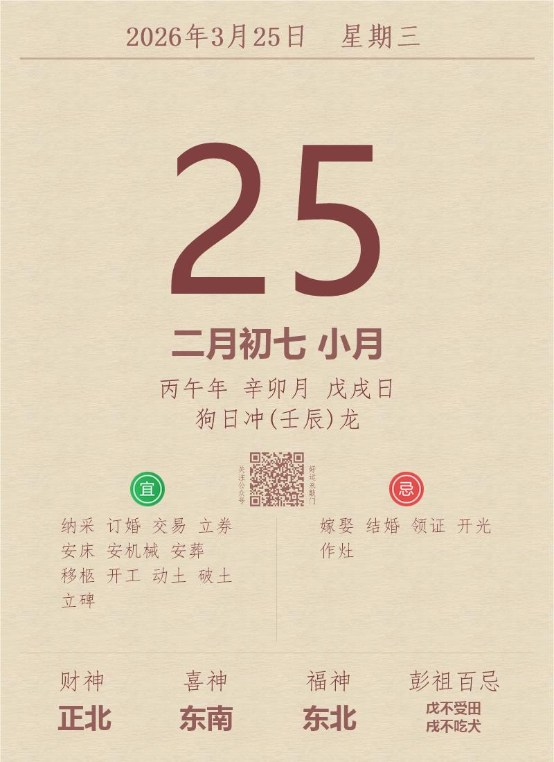 今日老黄历(2026年3月25日):黄历宜忌、财神方位、特吉生肖、打麻将财位