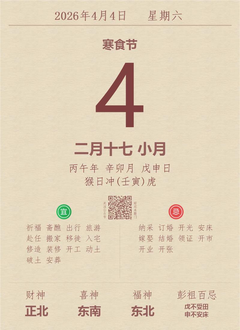今日老黄历(2026年4月4日):黄历宜忌、财神方位、特吉生肖、打麻将财位